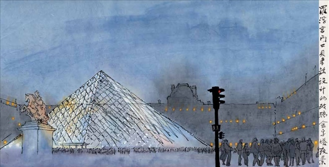 羅浮宮門口貝聿銘設計的玻璃金字塔夜景 35cm×68cm 1993 年