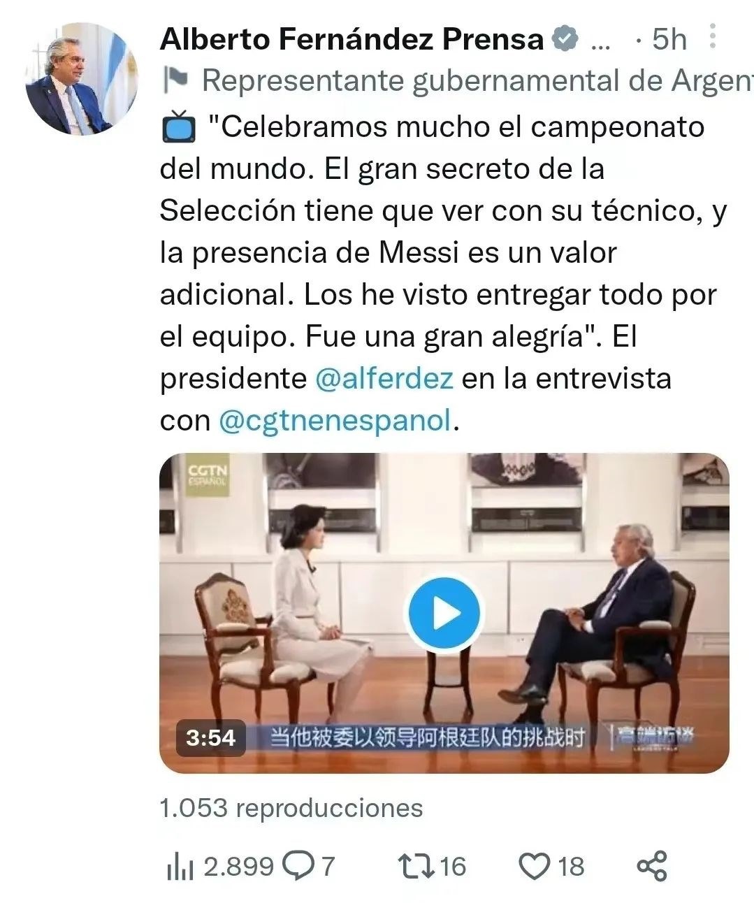 △阿根廷總統(tǒng)費(fèi)爾南德斯個(gè)人賬號(hào)發(fā)布十余條推文展示專(zhuān)訪內(nèi)容