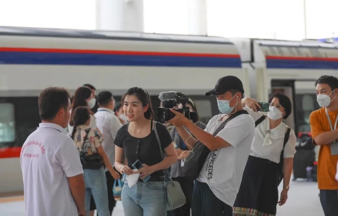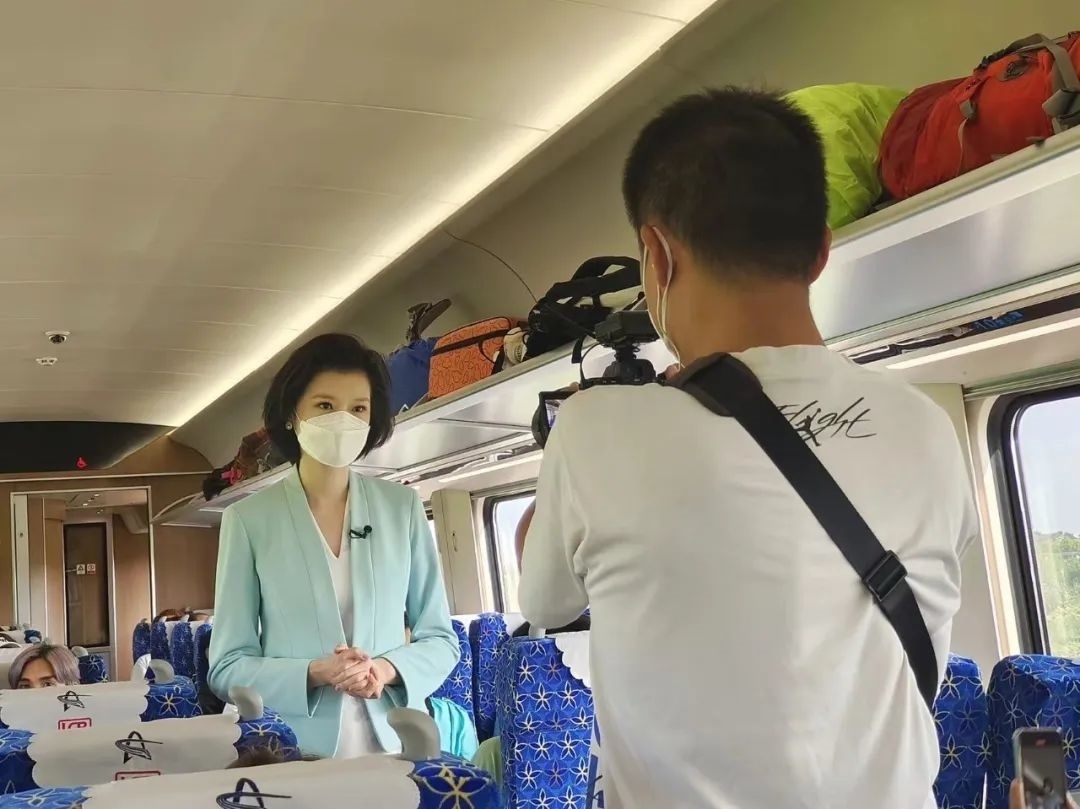 △總臺(tái)主持人鄒韻在中老鐵路“瀾滄號(hào)”動(dòng)車(chē)上采訪
