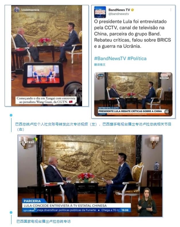 盧拉總統(tǒng)在其個(gè)人社交賬號(hào)轉(zhuǎn)發(fā)此次專(zhuān)訪視頻。巴西第二大電視臺(tái)旗手電視臺(tái)綜合頻道,在當(dāng)?shù)貢r(shí)間4月14日晚率先播出總臺(tái)《高端訪談》專(zhuān)訪盧拉總統(tǒng)的精華版,觸達(dá)巴西全境,完整版專(zhuān)訪于次日在該臺(tái)各頻道多次播出。巴西最大新聞門(mén)戶網(wǎng)站UOL、知名雜志《論壇》等也陸續(xù)上線本次專(zhuān)訪節(jié)目。