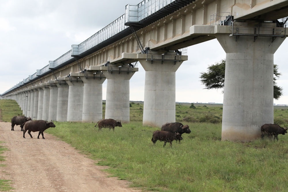 水牛在裝有聲屏障的肯尼亞內(nèi)羅畢國(guó)家公園特大橋下穿行(2021年5月19日攝)。中非共建的肯尼亞內(nèi)馬鐵路采用特大橋全程穿越內(nèi)羅畢國(guó)家公園方案,橋墩超過(guò)6米,讓長(zhǎng)頸鹿也能“昂首通過(guò)”;特大橋護(hù)欄兩側(cè)安裝聲屏障,極大降低火車(chē)通過(guò)時(shí)的噪音。