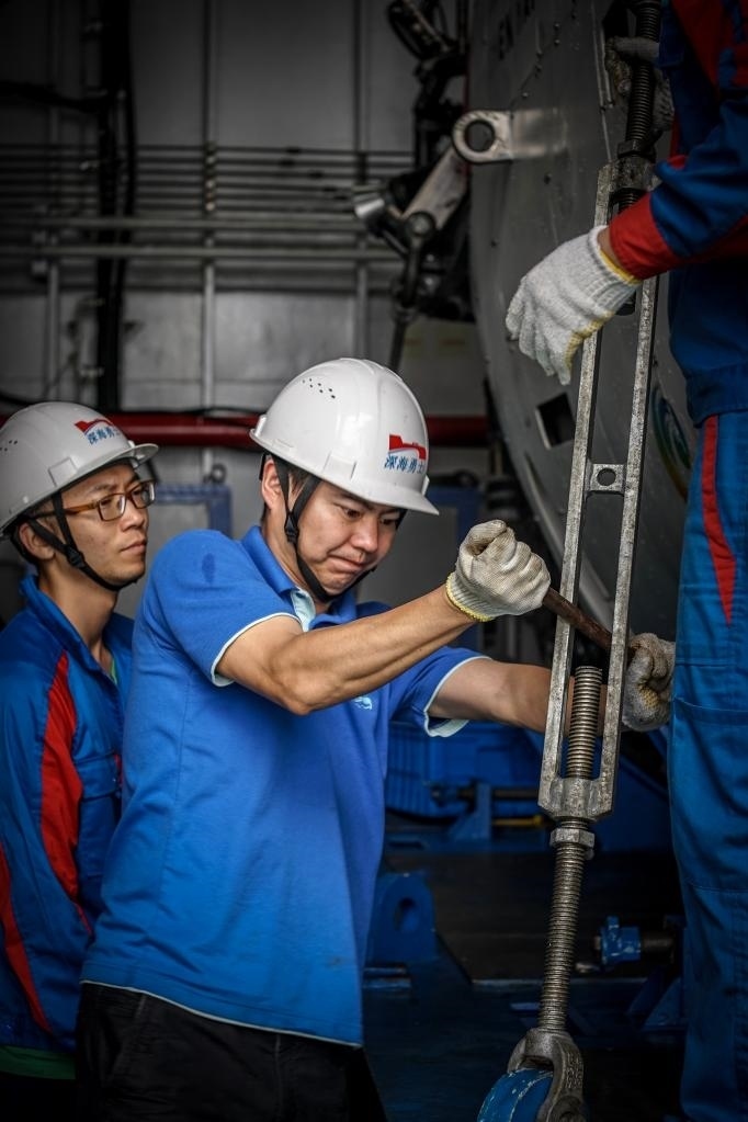 圖為楊申申(中)在海上試驗(yàn)現(xiàn)場(chǎng)忙碌工作。