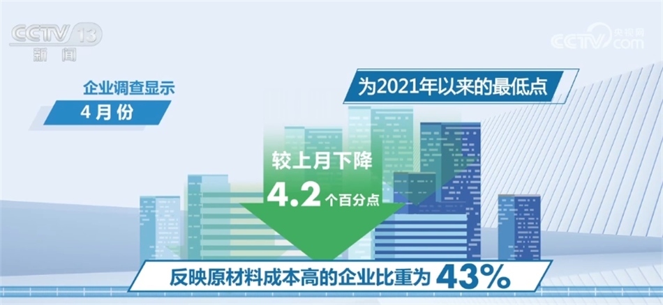 今年以來,原材料成本、物流和勞動力成本普遍回落。企業(yè)調查顯示,4月份反映原材料成本高的企業(yè)比重為43%,較上月下降4.2個百分點,為2021年以來的最低點。反映物流成本高和勞動力成本高的企業(yè)比重分別為27.5%和30%,較上月下降1.9和1.1個百分點。