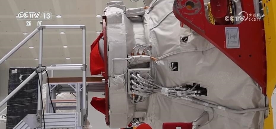 總臺央視記者 陶嘉樹:在我身后的就是天舟貨運(yùn)飛船,它的長度是10.6米,它整體分成兩個部分,下面比較小的這一部分是它的推進(jìn)艙,上面比較大的部分是它的貨物艙。天舟貨運(yùn)飛船總重13.5噸,從天舟六號開始,它的載貨量從以前的6.9噸提高到了7.4噸,是目前世界上運(yùn)貨能力最強(qiáng)的貨運(yùn)飛船之一。