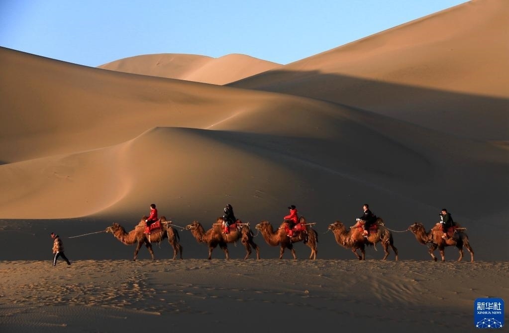 曹文華和他的駝隊載著游客行走在鳴沙山月牙泉景區(qū)的駝道上(4月24日攝)。
