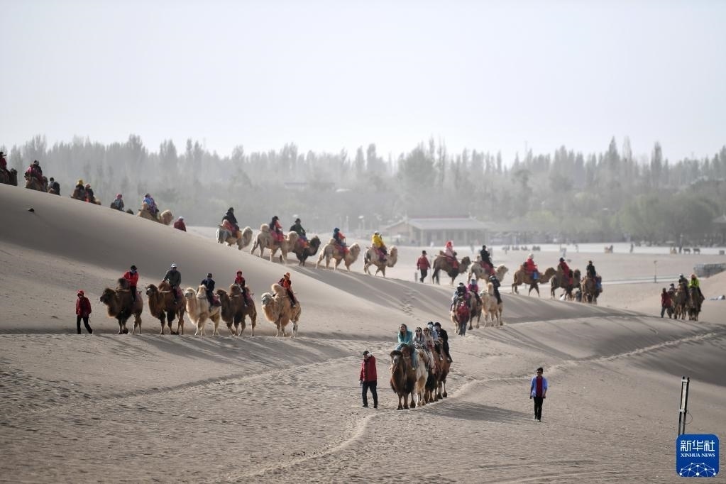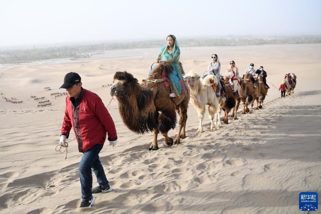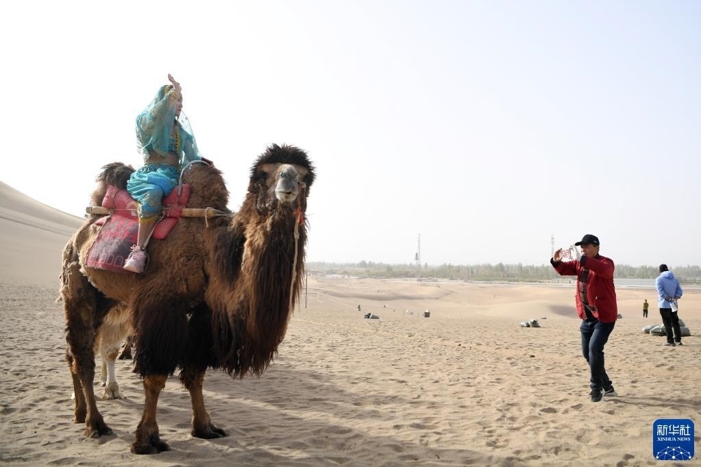 游客騎著駱駝在鳴沙山月牙泉景區(qū)游覽(4月29日攝)。