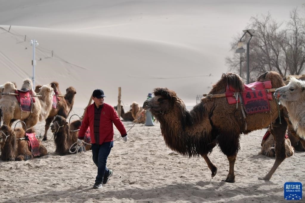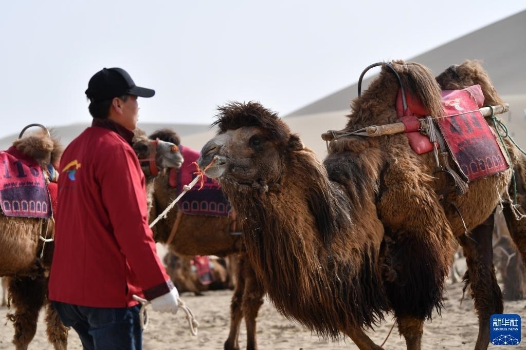 曹文華牽著駱駝在鳴沙山月牙泉景區(qū)駱駝騎乘點等待游客(4月24日攝)。