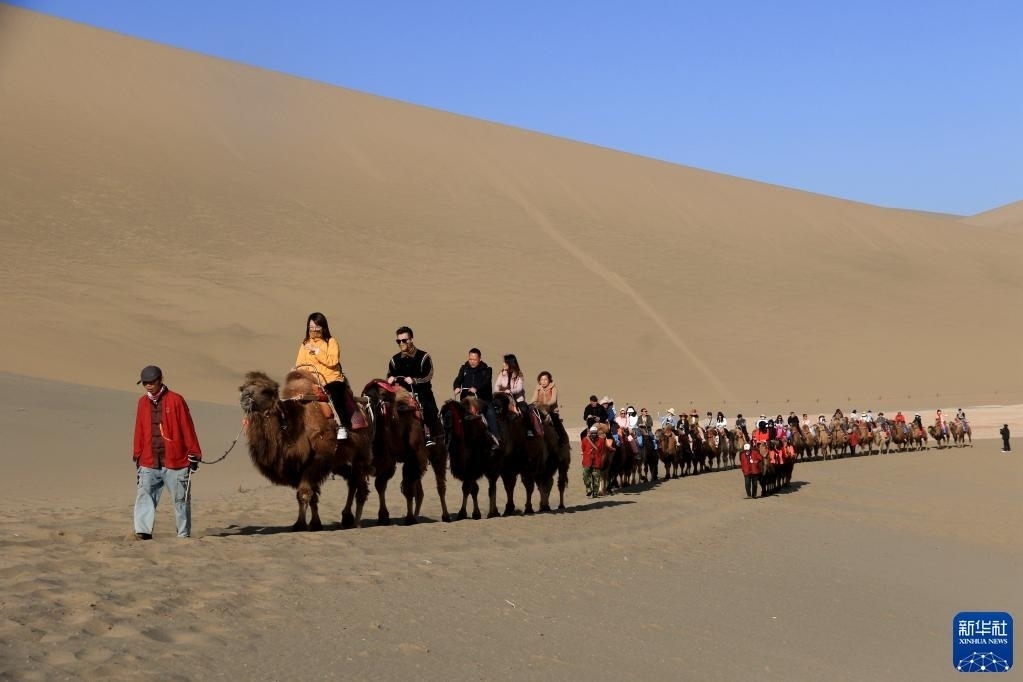金色的鳴沙山上響起陣陣駝鈴聲,編號“414”的領(lǐng)頭駱駝和51歲的牽駝人曹文華一起帶領(lǐng)著駝隊,馱著游客,朝連綿起伏的沙丘深處走去。