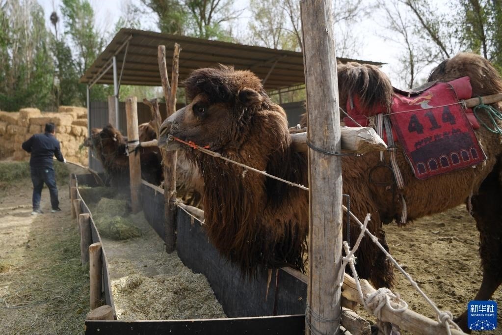 編號“414”的駱駝“上班”前在駝圈里吃草料(4月24日攝)。