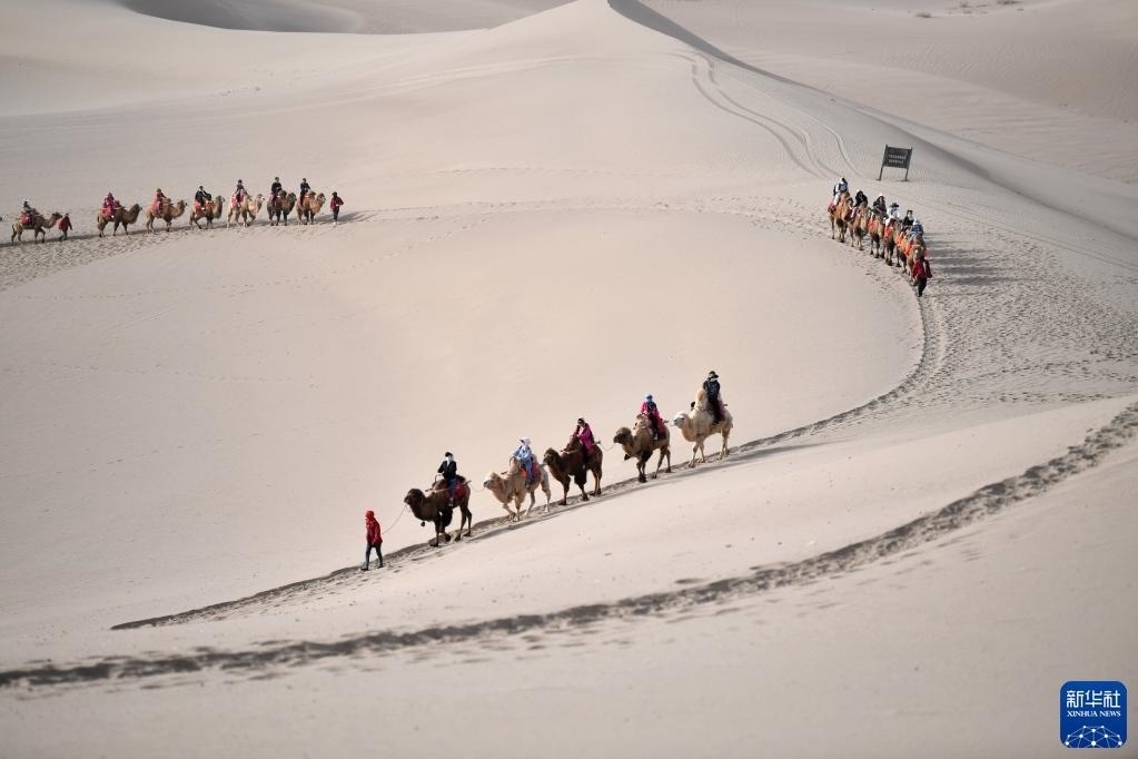 駝隊載著游客行走在鳴沙山月牙泉景區(qū)的駝道上(4月24日攝)。
