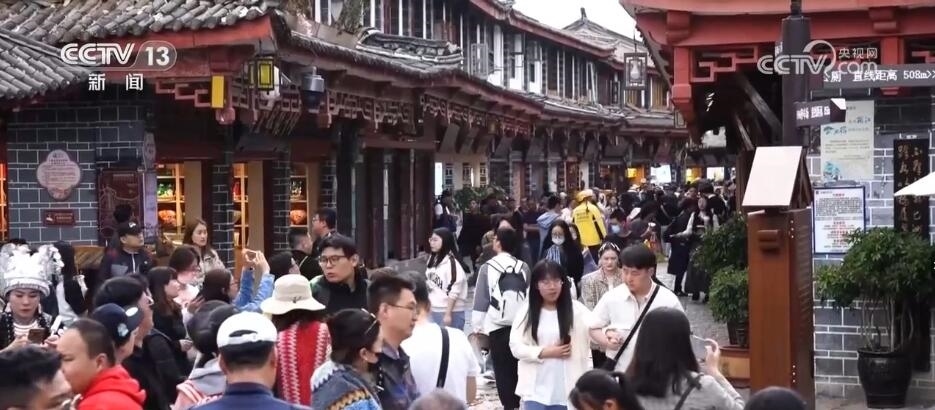 總臺(tái)記者 郭琳潔:“五一”假期第三天,臨近中午,麗江古城已經(jīng)是人流如織。游客有的是一家老小有說有笑,有的是三五好友打卡拍照。陽(yáng)光明媚的上午,漫步在古香古色的四方街,探訪小橋流水人家,非常愜意悠閑。商家們?yōu)榱擞佑慰鸵沧鲎懔藴?zhǔn)備,各種特色工藝品、熱氣騰騰的美食隨處可見,還有民族特色的歌舞表演,讓大家感受納西族傳統(tǒng)文化的魅力。
