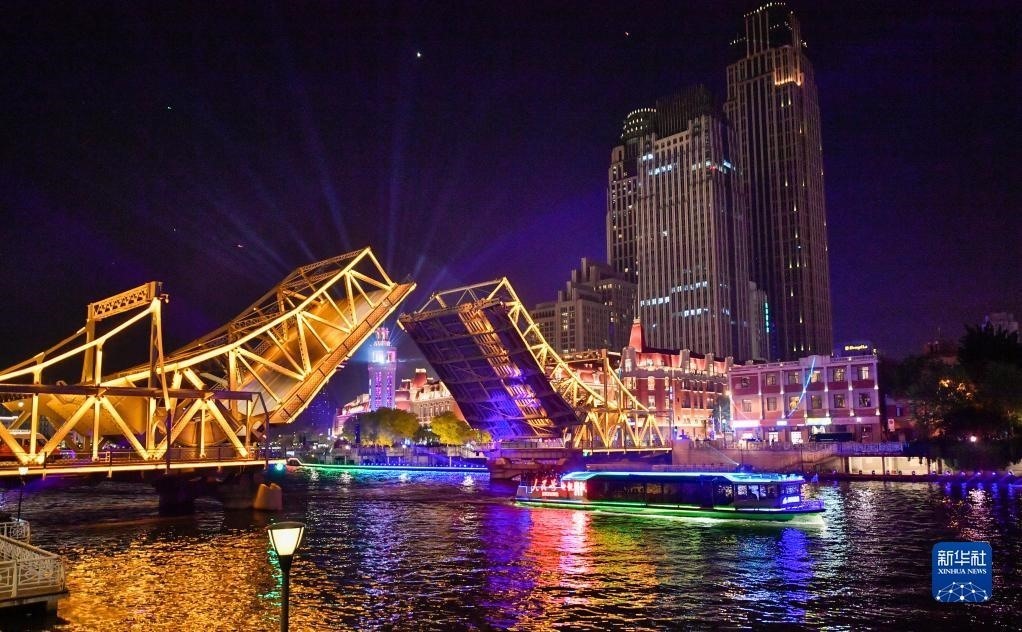 5月1日晚,位于天津海河上的標(biāo)志性建筑物解放橋橋梁開啟,橋梁開啟角度達(dá)到最大角度60度。