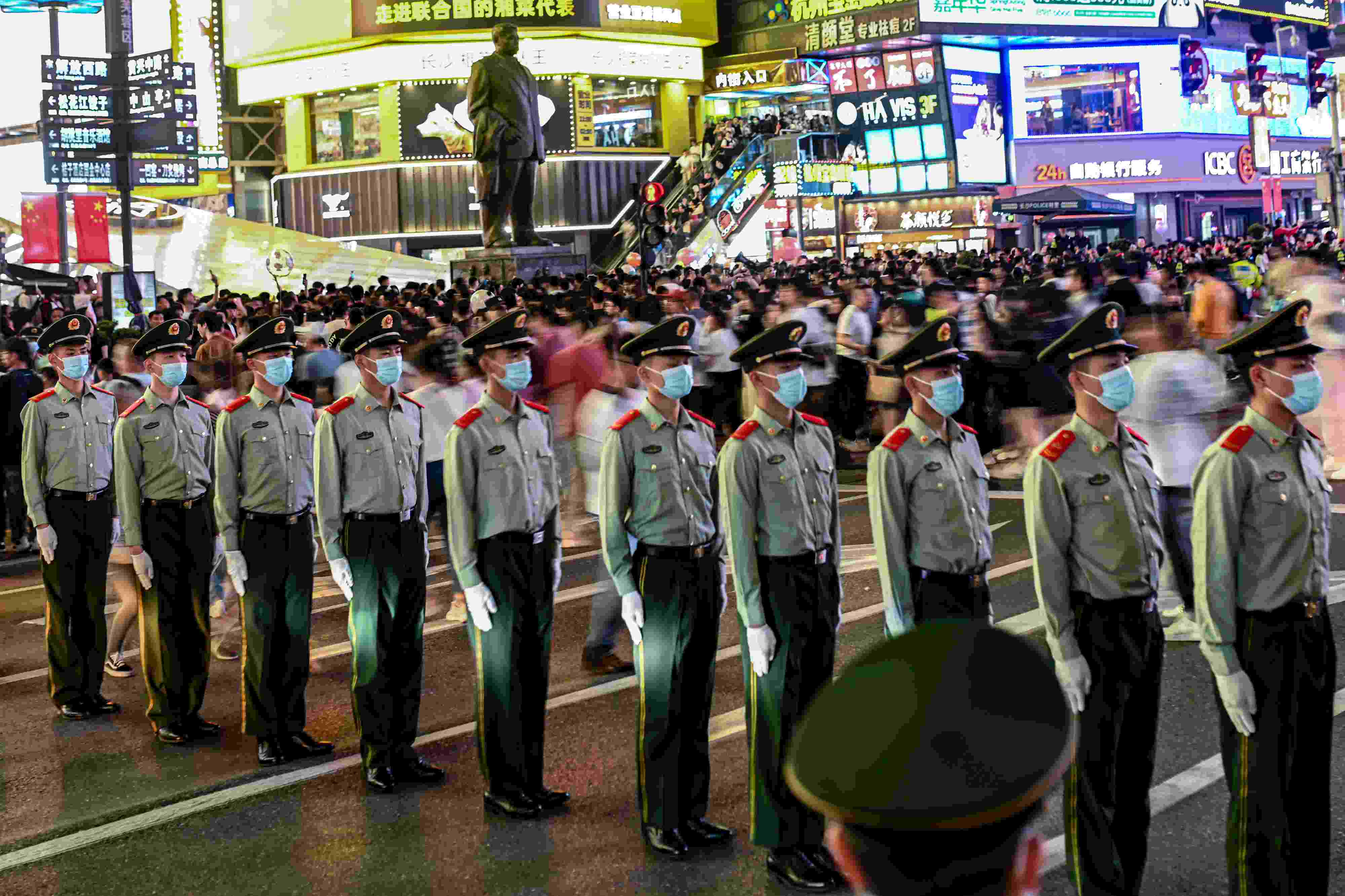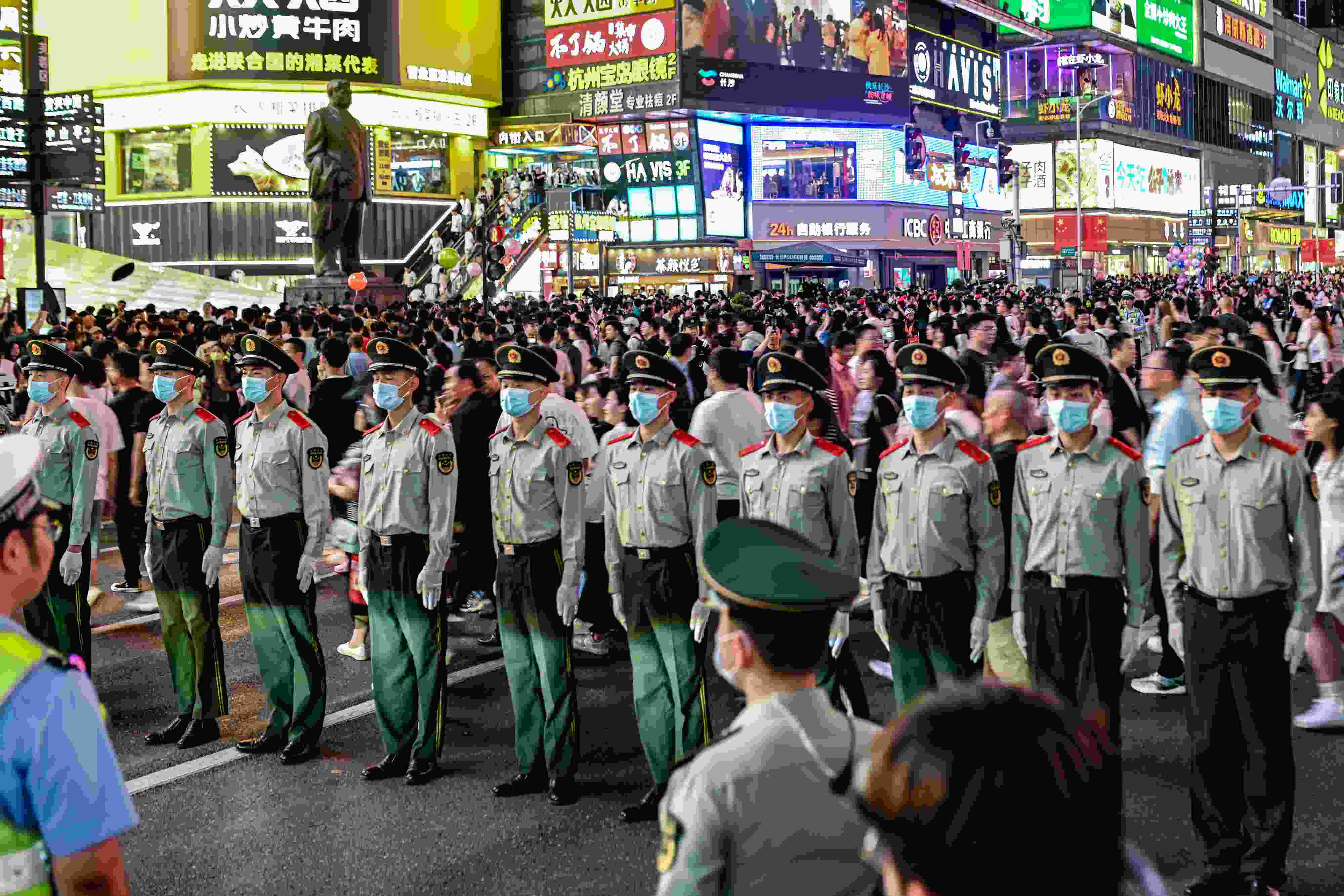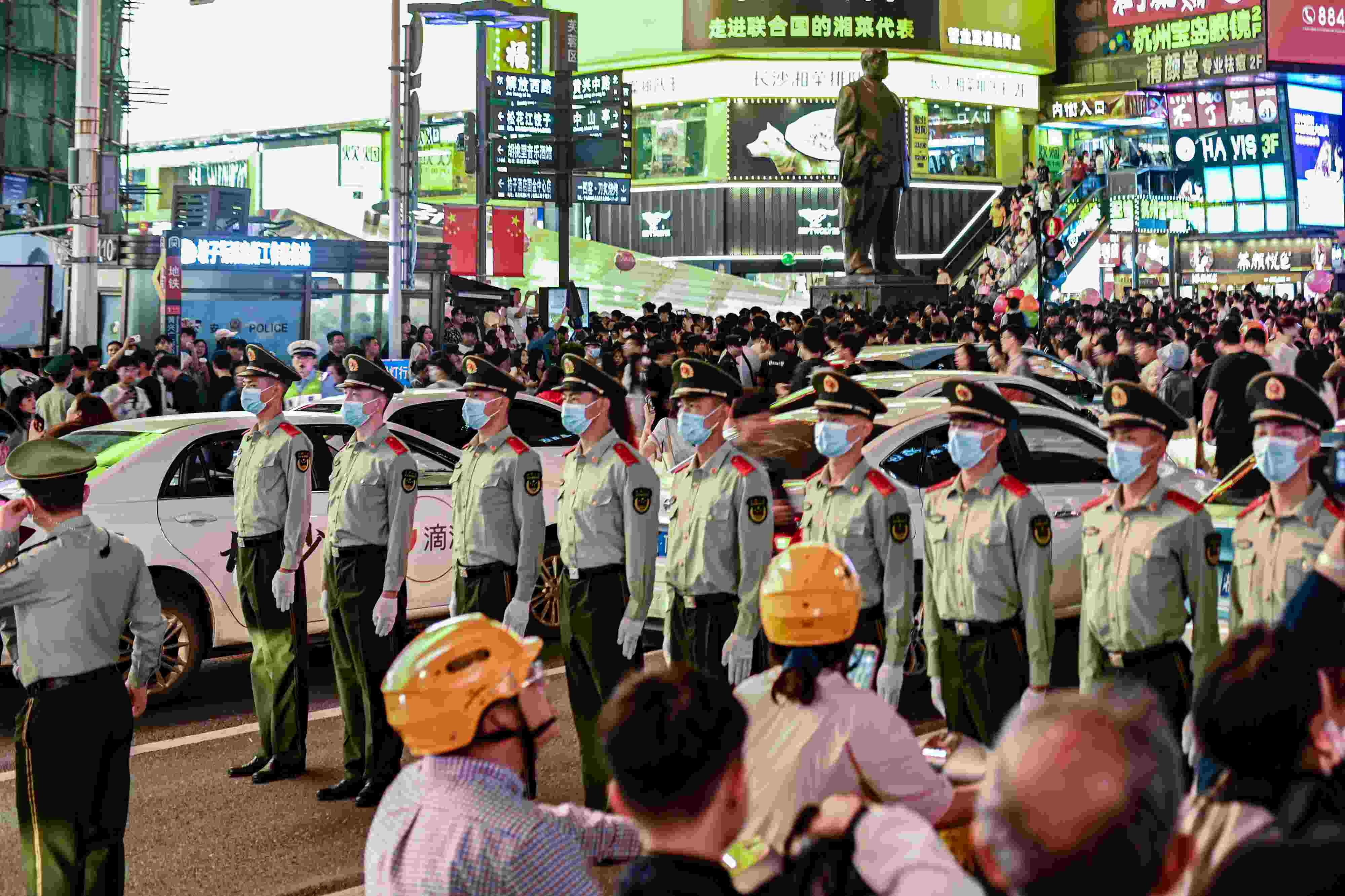 2023年5月1日,長沙,“五一”小長假,五一商圈成為眾多游客必到打卡地,為了保障人民群眾的安全,武警長沙支隊官兵同長沙公安民警一道,在市中心解放西路與黃興中路的十字路口,筑起“人墻”,守護行人安全通行。 視覺中國