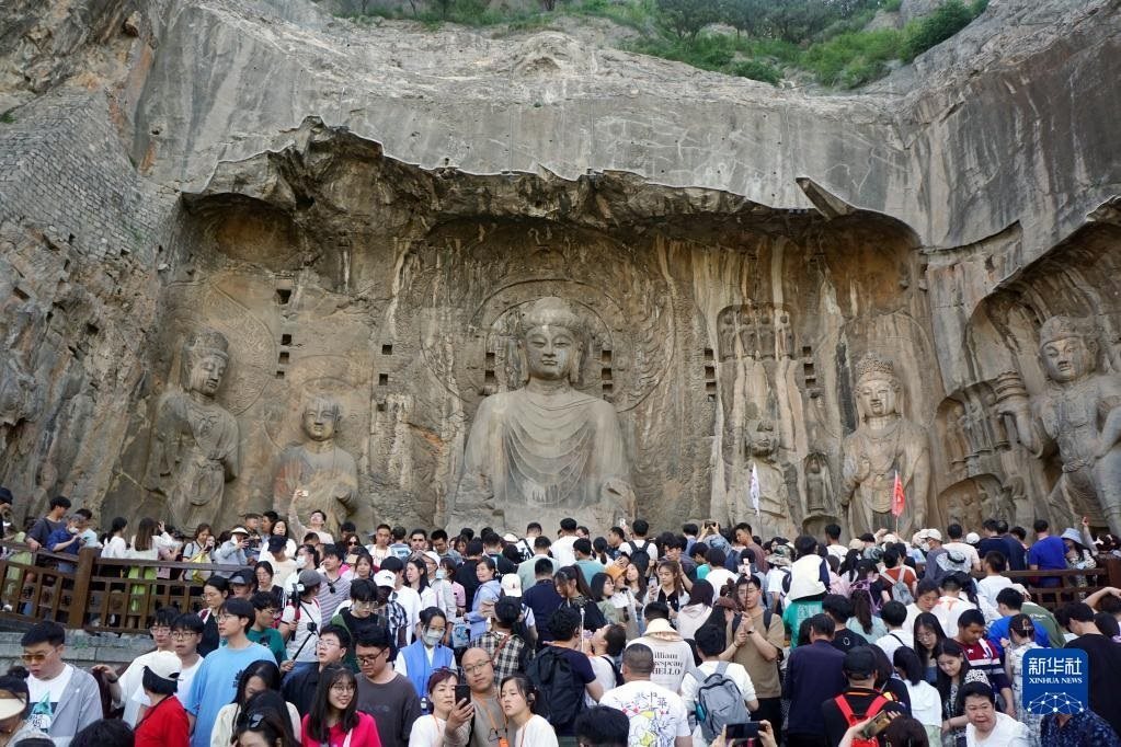 4月30日,游客在河南洛陽龍門石窟景區(qū)游覽。