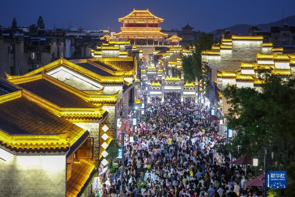 4月30日,游客在湖北襄陽古城北街游玩。