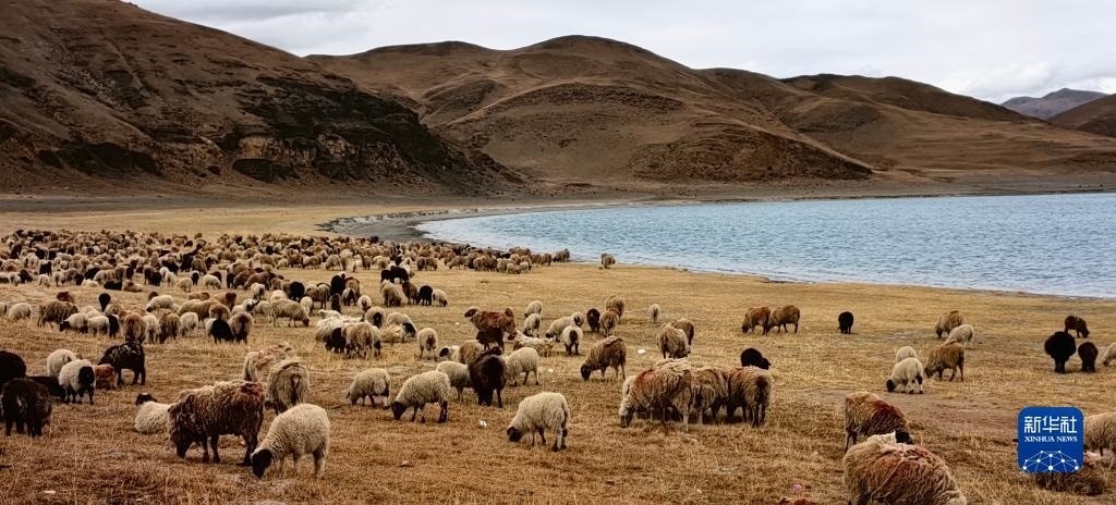 羊卓雍錯湖邊的羊群(5月1日攝,手機照片)。   新華社記者 沈虹冰 攝