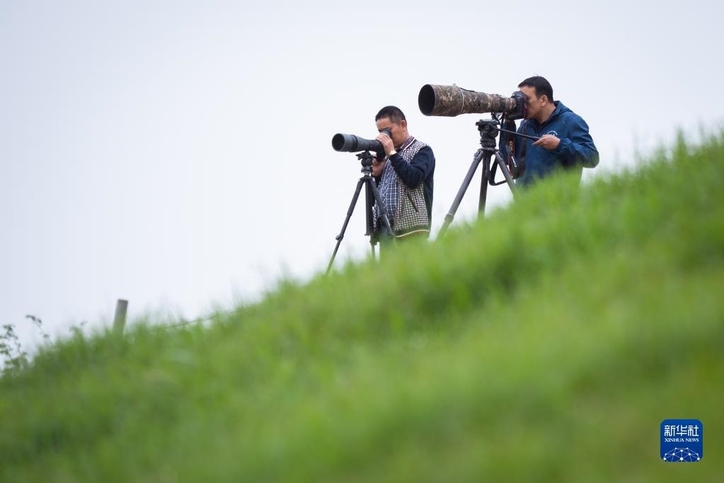 4月29日,在石首麋鹿國(guó)家級(jí)自然保護(hù)區(qū),工程師張玉銘(右)和巡護(hù)員劉吉高在觀測(cè)遠(yuǎn)處的麋鹿群。