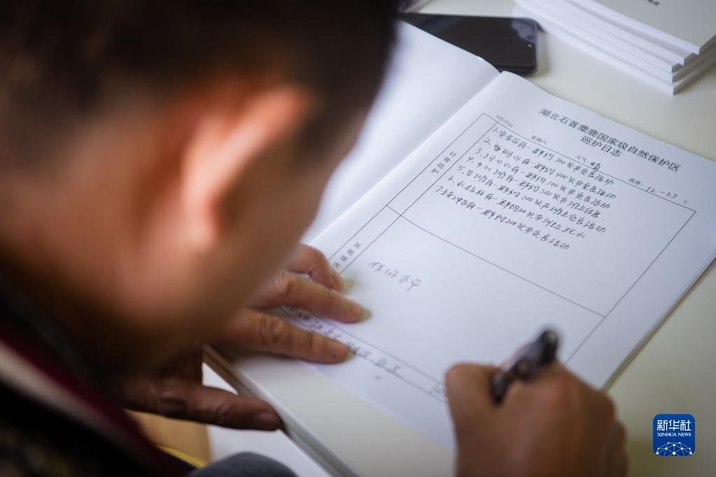4月29日,在石首麋鹿國(guó)家級(jí)自然保護(hù)區(qū),巡護(hù)員劉吉高填寫(xiě)巡護(hù)日志。