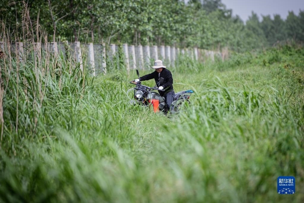 4月29日,在石首麋鹿國(guó)家級(jí)自然保護(hù)區(qū),巡護(hù)員王傳軍騎車(chē)在齊腰高的野草中巡邏。