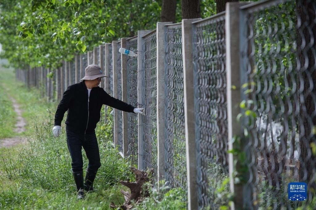 4月29日,巡護(hù)員王傳軍在石首麋鹿國(guó)家級(jí)自然保護(hù)區(qū)檢查鐵絲網(wǎng)。