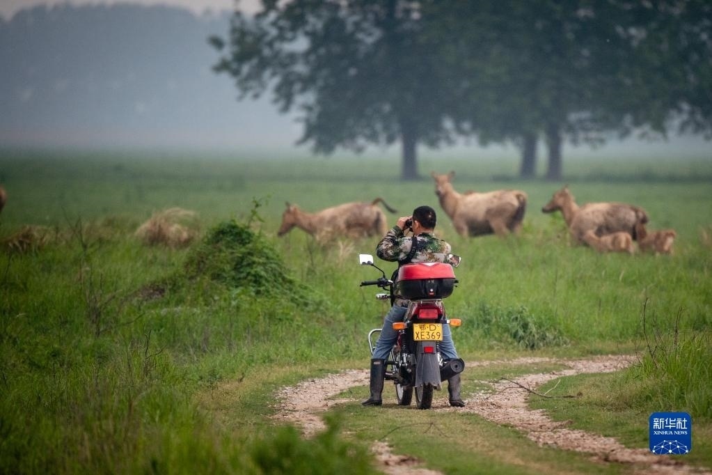 4月28日,在石首麋鹿國(guó)家級(jí)自然保護(hù)區(qū),巡護(hù)員劉吉高觀測(cè)遠(yuǎn)處的一群麋鹿。