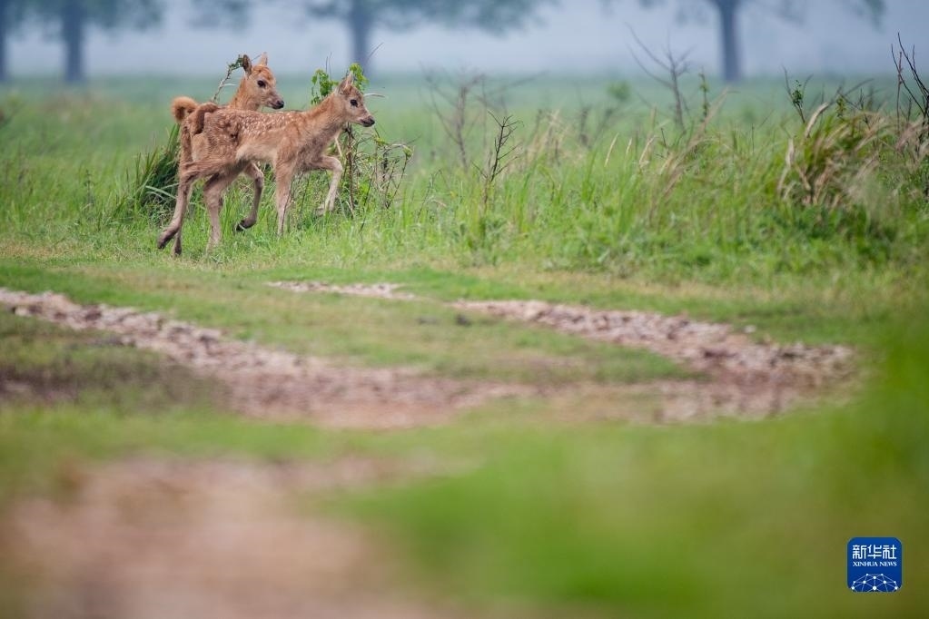 4月28日,幾頭幼鹿跟隨麋鹿群在石首麋鹿國(guó)家級(jí)自然保護(hù)區(qū)內(nèi)活動(dòng)。