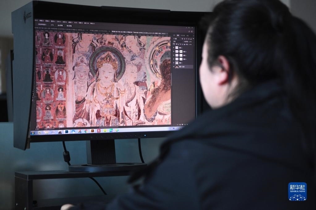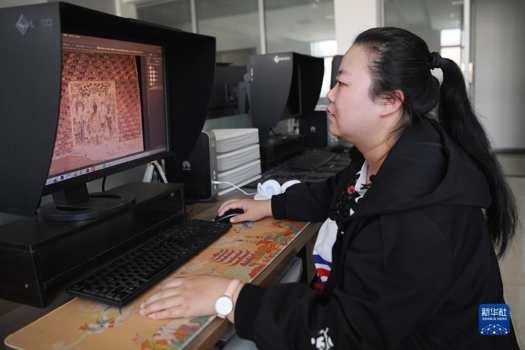 敦煌研究院文物數(shù)字化保護(hù)團(tuán)隊(duì)圖像處理人員年海麗在拼接壁畫圖像(4月25日攝)。