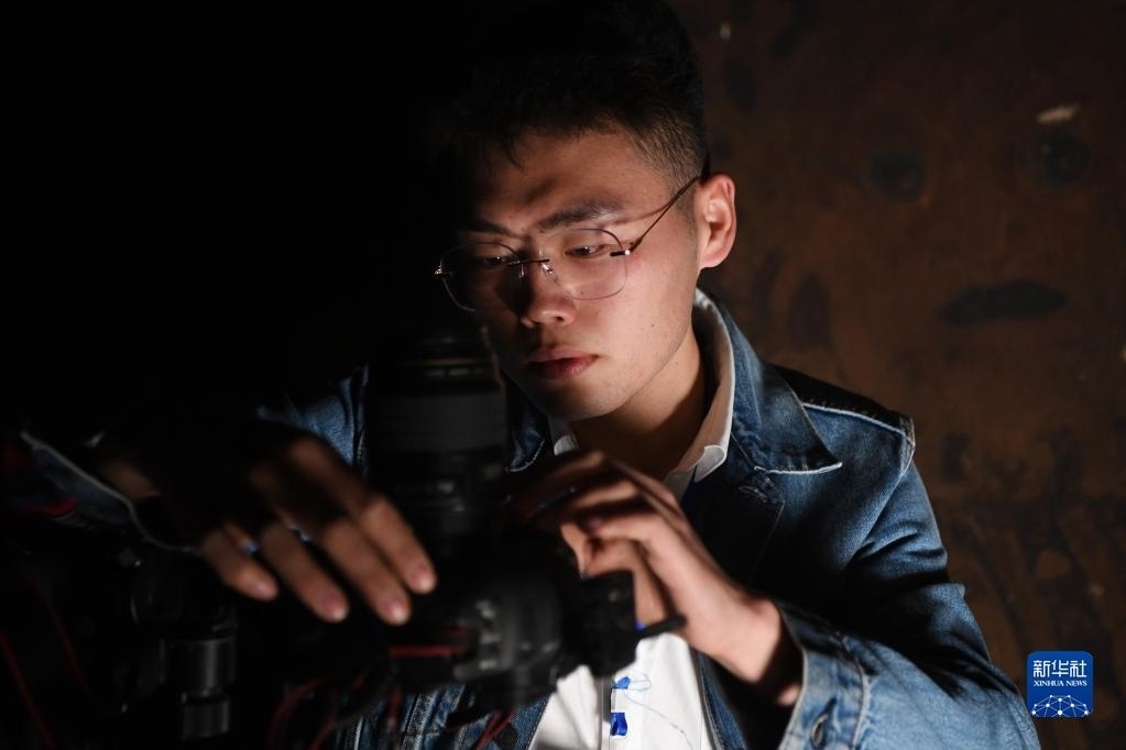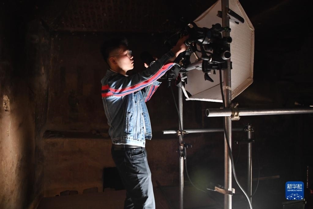 敦煌研究院文物數(shù)字化保護(hù)團(tuán)隊(duì)圖像采集人員熊業(yè)騰在洞窟內(nèi)調(diào)試設(shè)備,準(zhǔn)備進(jìn)行壁畫圖像采集(4月25日攝)。