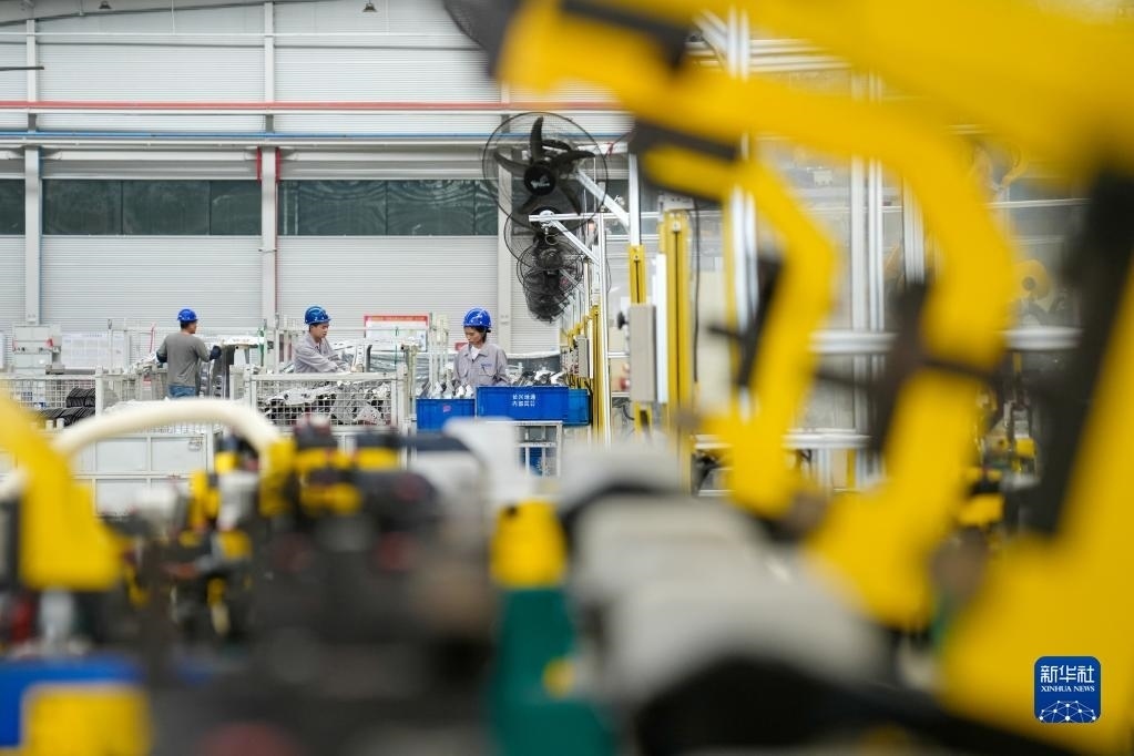 5月4日,在浙江省湖州市長(zhǎng)興經(jīng)濟(jì)技術(shù)開(kāi)發(fā)區(qū)一家汽車部件有限公司,工人生產(chǎn)新能源汽車配件。