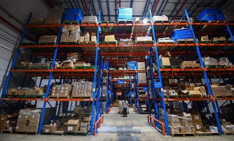 2022年9月2日,在杭州綜合保稅區(qū)一家跨境保稅倉內(nèi),工作人員在搬運跨境電商保稅進(jìn)口商品。新華社記者 徐昱 攝