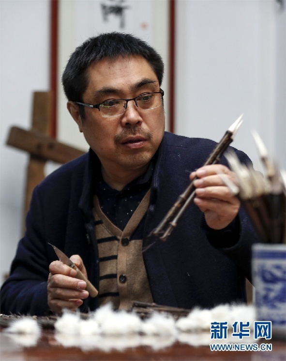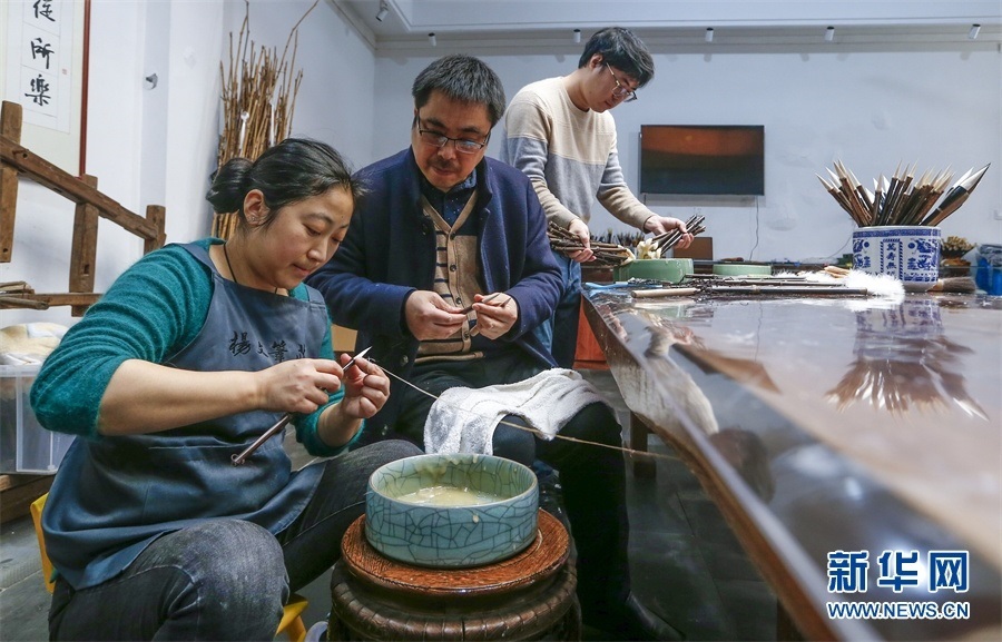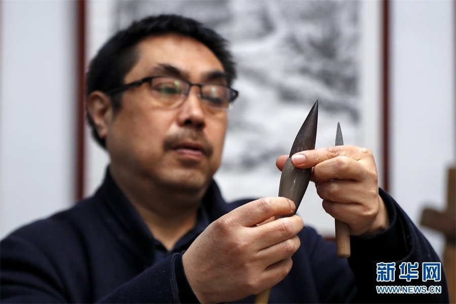 一支好的徽筆,不僅要保留傳統(tǒng)工藝,且要在原基礎(chǔ)上不斷創(chuàng)新、改良。楊文尤其重視書畫家對筆的使用反饋:“因為他們對用筆最挑剔,而且現(xiàn)代書畫家創(chuàng)作方式和作品不斷創(chuàng)新,對毛筆也有新的要求,他們提出的要求我總是盡力去滿足,也使得制筆技藝進(jìn)一步得到了提高?!? 新華網(wǎng)發(fā)(施亞磊 攝)