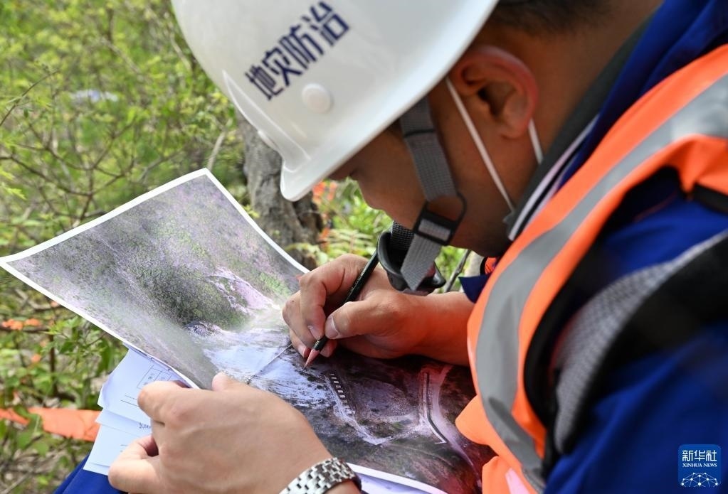 5月9日,在偏橋子滑坡地質(zhì)災(zāi)害隱患點(diǎn),參賽選手標(biāo)記滑坡體信息。   新華社記者 趙子碩 攝