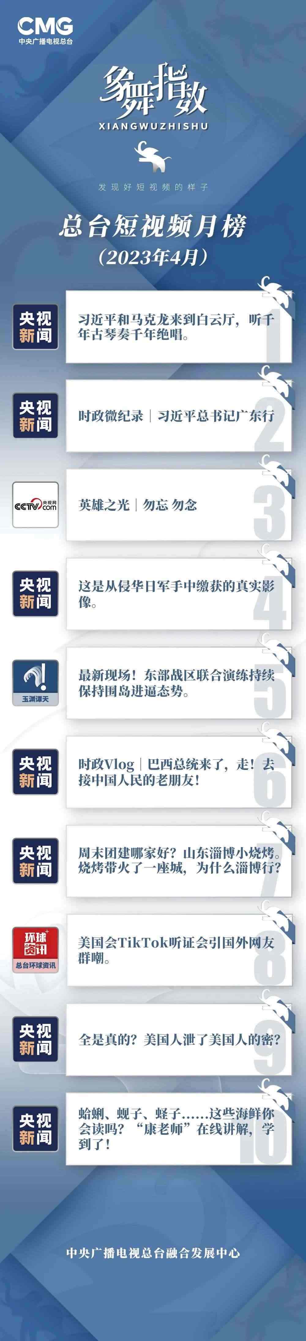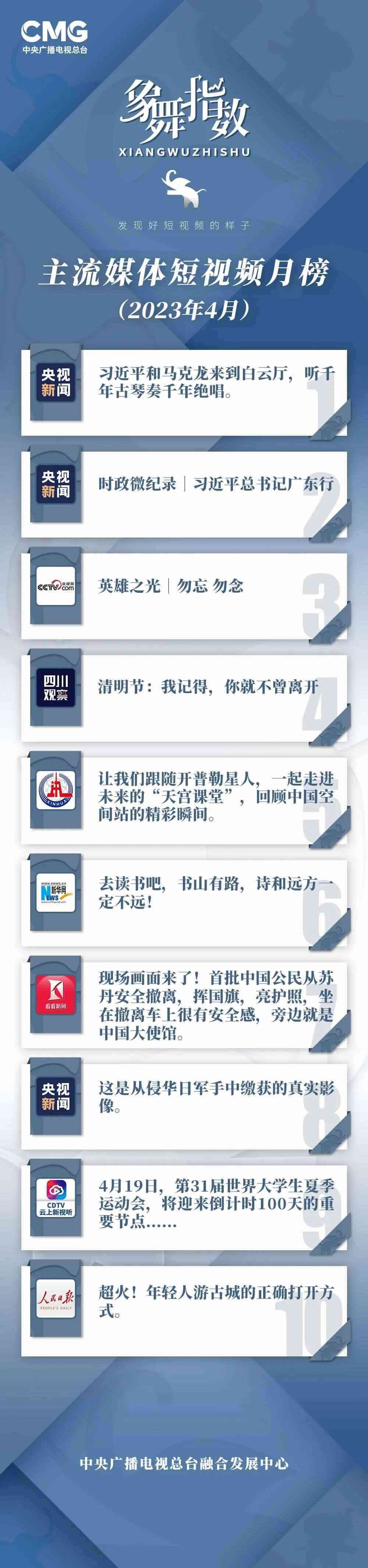 中央廣播電視總臺“象舞指數(shù)”評議品牌,推出主流媒體短視頻月榜、總臺短視頻月榜。在2023年4月,這些內容引發(fā)大眾關注: