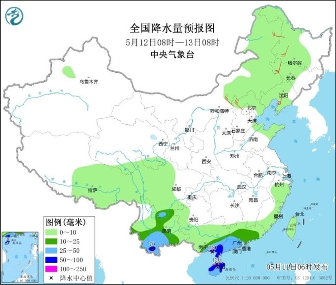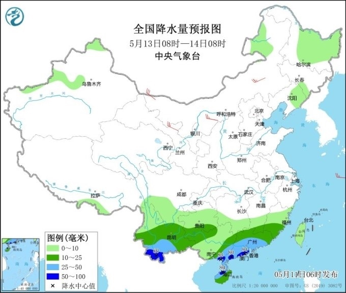 預(yù)計(jì)未來(lái)三天(11日至13日),華南地區(qū)仍有較強(qiáng)降雨,廣西、廣東、海南島等地大部地區(qū)日雨量有中到大雨,局地暴雨或大暴雨;此外,云南中南部有中到大雨,局地暴雨。