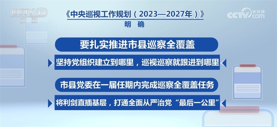 央視網(wǎng)消息:近日,經(jīng)黨中央同意,中共中央辦公廳印發(fā)了《中央巡視工作規(guī)劃(2023—2027年)》,對(duì)今后5年的巡視工作作出了部署。一屆任期內(nèi)實(shí)現(xiàn)巡視全覆蓋,是黨章規(guī)定的政治任務(wù)。通過(guò)什么樣的方式實(shí)現(xiàn)二十屆中央巡視全覆蓋?采取哪些措施高質(zhì)量推進(jìn)巡視全覆蓋?在此次印發(fā)的巡視工作規(guī)劃中都作出了要求。