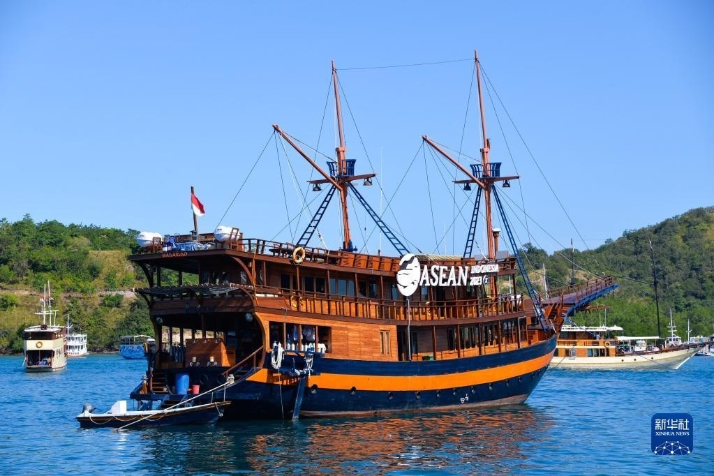 這是5月12日在印度尼西亞拉布安巴焦海邊拍攝的一艘掛著2023年東盟峰會標志的游船。