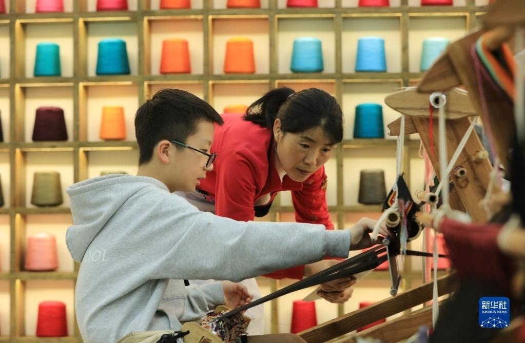 5月12日,來(lái)自上海包玉剛實(shí)驗(yàn)學(xué)校的學(xué)生在張家界市武陵源區(qū)乖幺妹土家族織錦基地學(xué)習(xí)體驗(yàn)土家族織錦非遺技藝。