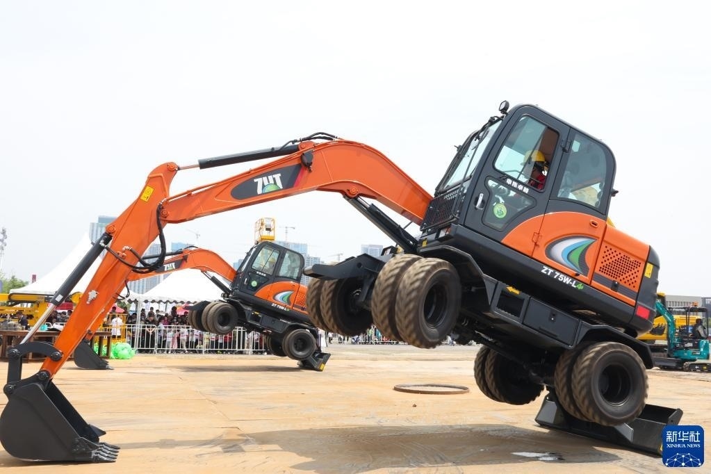5月13日,在長沙國際工程機(jī)械展覽會(huì)上,機(jī)手駕駛輪式挖掘機(jī)表演。