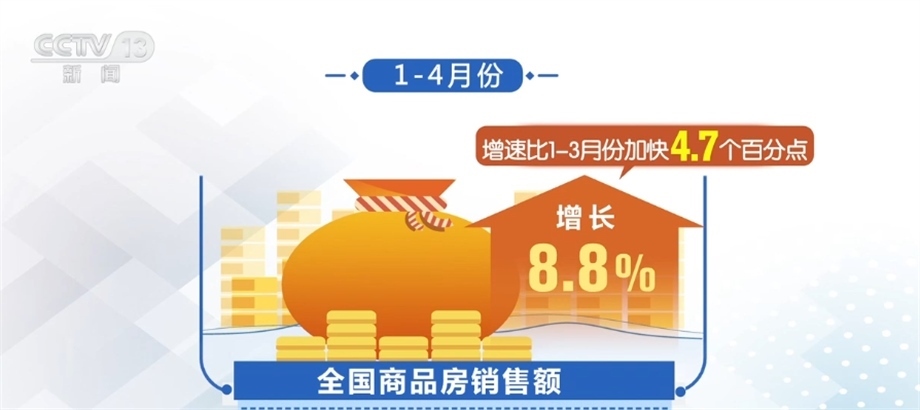從銷售看,隨著政策效應(yīng)逐步顯現(xiàn),以及前期疫情積累的需求釋放,1—4月份,全國商品房銷售面積同比下降0.4%,降幅比1—3月份收窄1.4個百分點(diǎn)。銷售額增長8.8%,增速比1—3月份加快4.7個百分點(diǎn)。