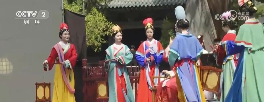 在晉祠的標(biāo)志性建筑圣母殿前,一場場穿越古今的表演登臺亮相?!稌x祠十二時辰》由晉祠講解員自行編排而成,生動還原了圣母殿內(nèi)人物的一天。從服飾裝扮到生活起居,她們用舞蹈讓雕塑“活”了起來,也使游客從別樣的角度領(lǐng)略了圣母殿折射出的文化魅力。
