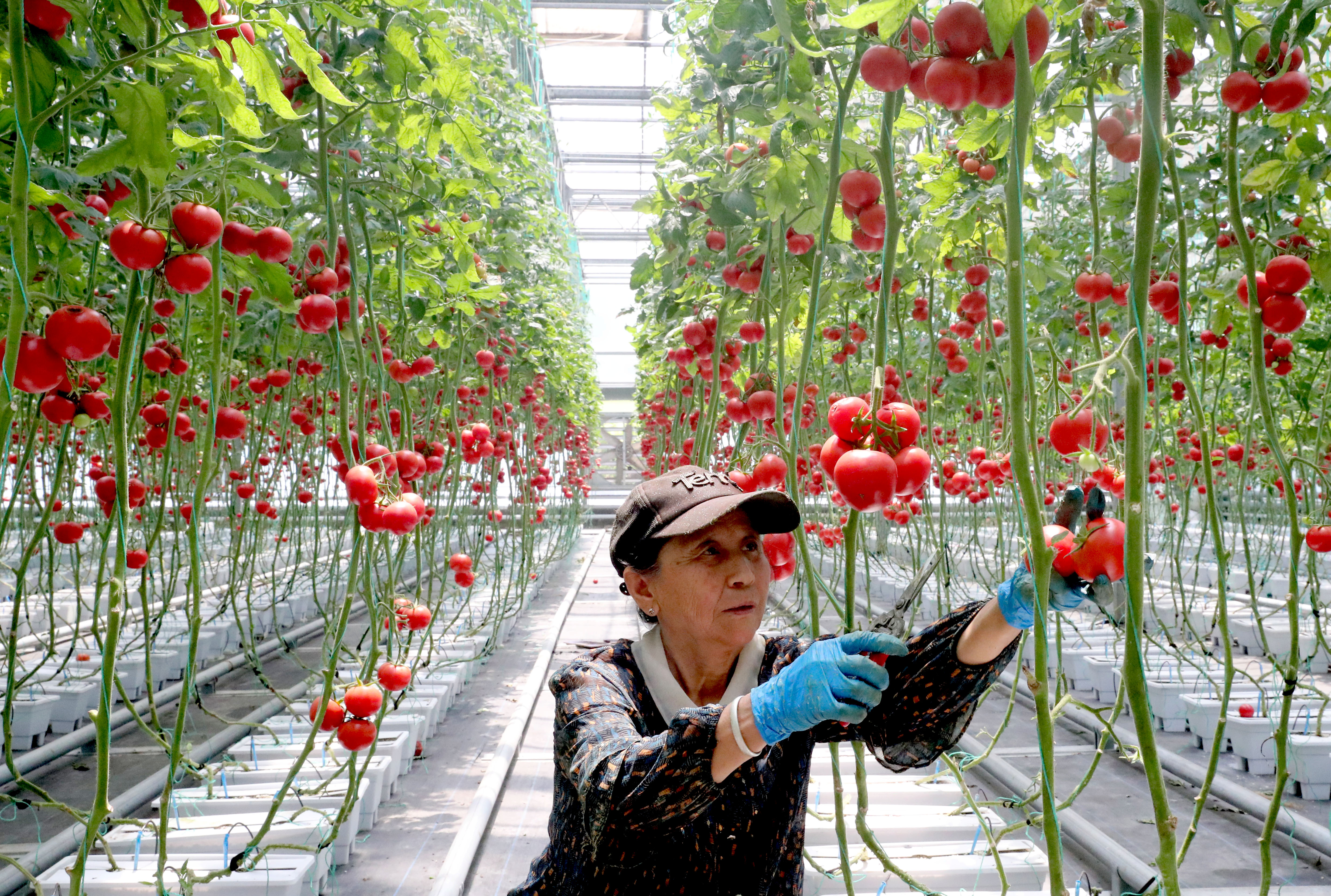 5月15日,村民在青島市即墨區(qū)北安街道一家智慧農(nóng)場內(nèi)采摘西紅柿供應(yīng)市場。 張進(jìn)剛 攝