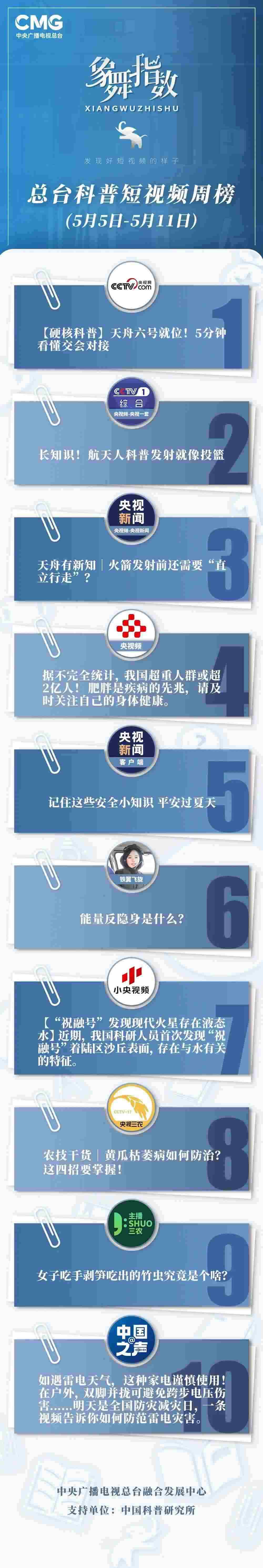 中央廣播電視總臺“象舞指數(shù)”評議品牌,推出科普短視頻周榜、總臺科普短視頻周榜。在2023年5月5日-5月11日,值得注目的內(nèi)容有: