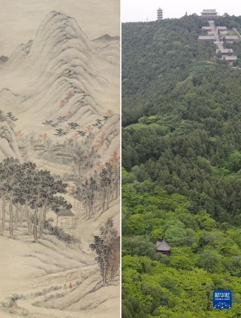 這是一張拼版照片,左圖為:《八公秋霽圖》,由清代畫家潘思牧創(chuàng)作,現收藏于安徽博物院(新華社發(fā),李鵬飛 攝);右圖為:5月16日拍攝的位于安徽省淮南市壽縣的八公山風景區(qū)(無人機照片,新華社記者張端攝)。