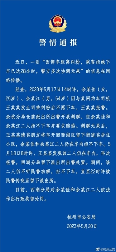 ·近日,杭州兩名乘客與網(wǎng)約車司機(jī)發(fā)生糾紛,賴在車上不走超過(guò)28小時(shí),警方多次調(diào)解無(wú)果,最終兩名乘客被處以行政拘留。