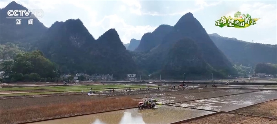 跟隨鏡頭,我們來到了貴州興義市的水稻高產(chǎn)示范田,插秧機正在田里忙碌,大小不一的水田正陸續(xù)插上嫩綠的秧苗。