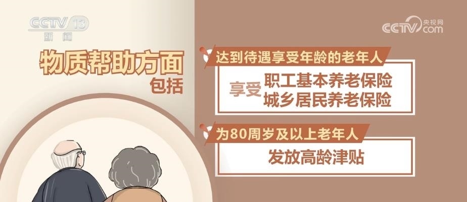 物質(zhì)幫助方面包括:達(dá)到待遇享受年齡的老年人享受職工基本養(yǎng)老保險和城鄉(xiāng)居民養(yǎng)老保險;為80周歲及以上老年人發(fā)放高齡津貼;為經(jīng)濟(jì)困難的老年人提供養(yǎng)老服務(wù)補(bǔ)貼;為經(jīng)認(rèn)定生活不能自理的老年人提供護(hù)理補(bǔ)貼;為納入最低生活保障范圍的老年人提供最低生活保障;經(jīng)認(rèn)定符合條件的殘疾老年人享受困難殘疾人生活補(bǔ)貼和重度殘疾人護(hù)理補(bǔ)貼;對生活無著的流浪、乞討老年人依照有關(guān)規(guī)定給予救助。