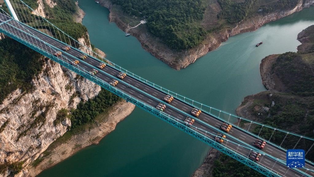 當(dāng)日,由貴州路橋集團承建的金烽烏江大橋進行靜態(tài)荷載試驗,48輛負(fù)載砂石的大型貨車有序行駛到固定的位置進行對稱、偏心檢測,檢驗橋梁結(jié)構(gòu)整體的施工質(zhì)量與受力性能,為橋梁竣工驗收提供科學(xué)依據(jù)。