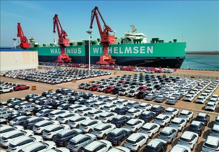 一艘滾裝船在江蘇連云港港東方港務分公司碼頭裝運出口汽車(2023年5月16日攝) 王健民攝 / 本刊