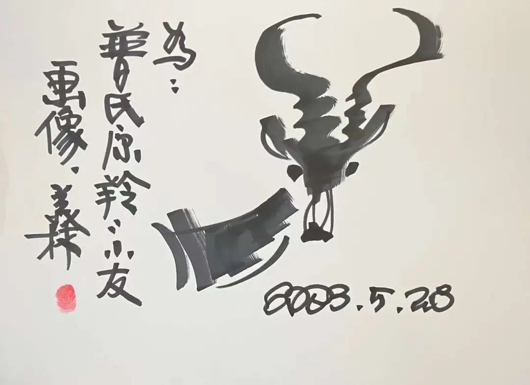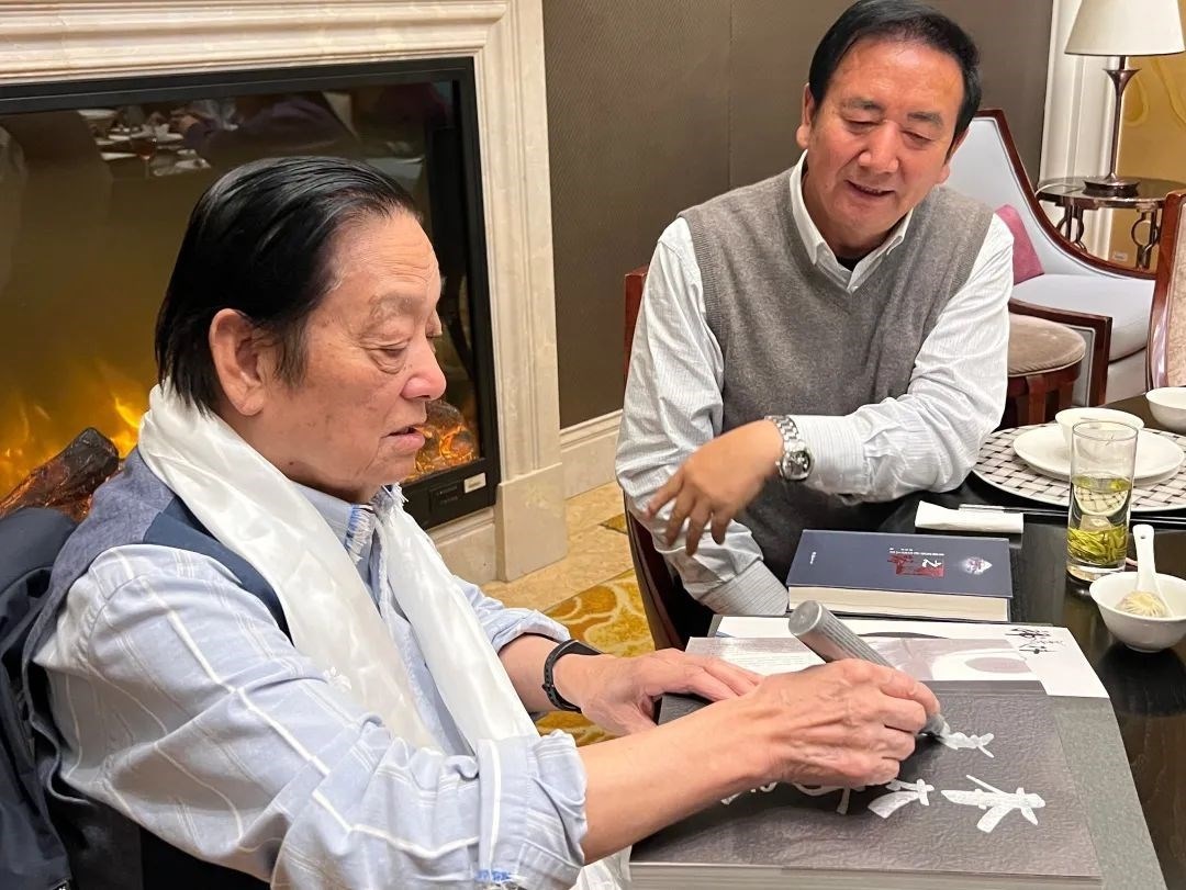 ▲韓美林為原青海省第十二屆人大常委會(huì)黨組副書(shū)記,現(xiàn)三江源生態(tài)保護(hù)基金會(huì)理事長(zhǎng)鄧本太簽書(shū)留念
