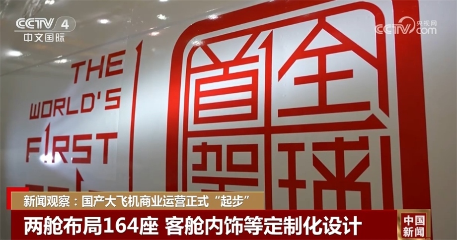 今天執(zhí)行商業(yè)首飛的C919飛機為164座兩艙布局,公務艙8座,經(jīng)濟艙156座??团搩?nèi)飾、旅客座椅、機載娛樂系統(tǒng)和飛機外部涂裝做了定制化設計。機身前部印有“全球首架”的“中國印”標識和對應英文。飛機注冊號B-919A,“B”代表飛機的中國國籍,“919”和型號名稱契合,“A”則有首架之意,突顯這一全球新機型、全球首架的非凡意義。